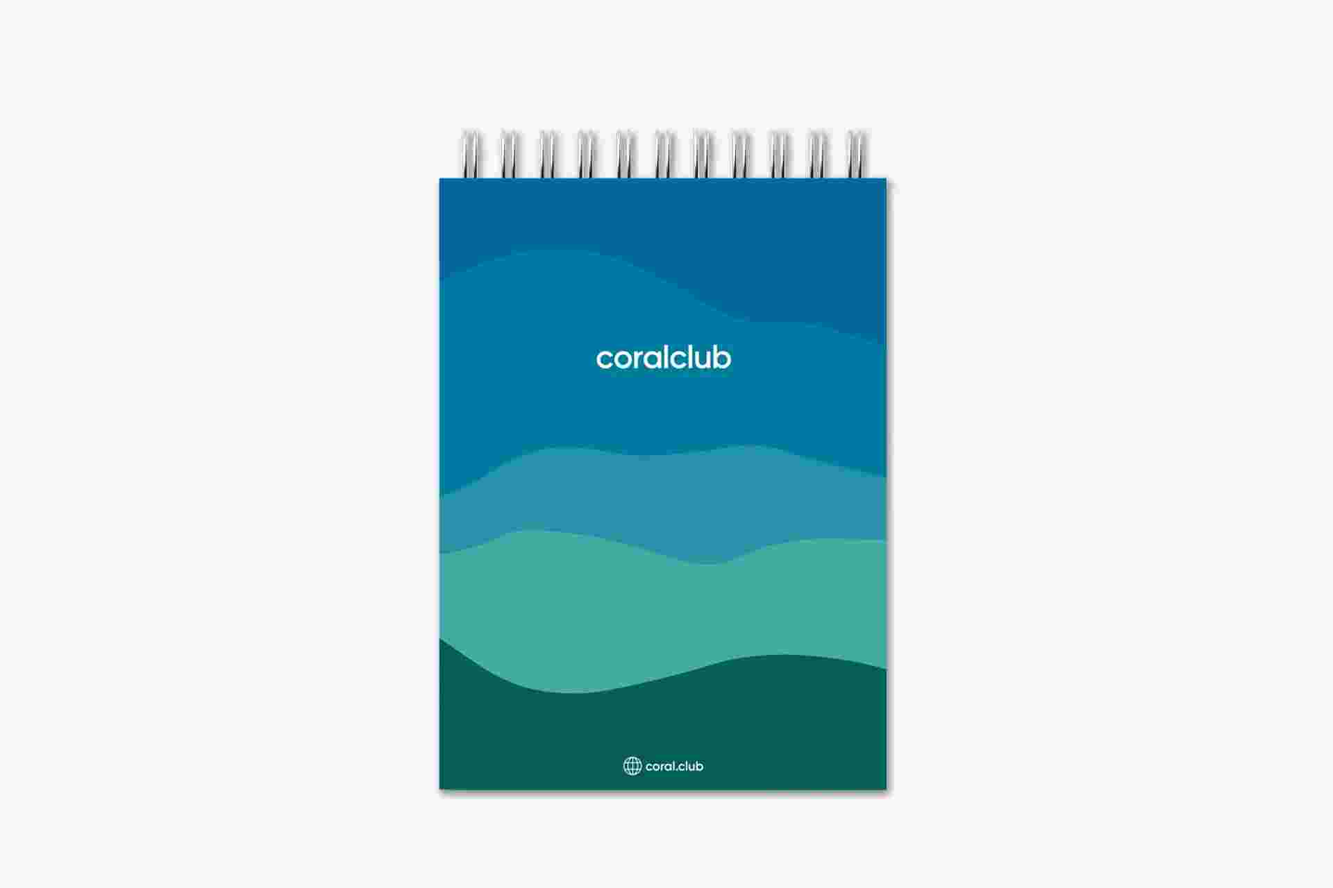 Brightly colored notebook with Coral Club logo